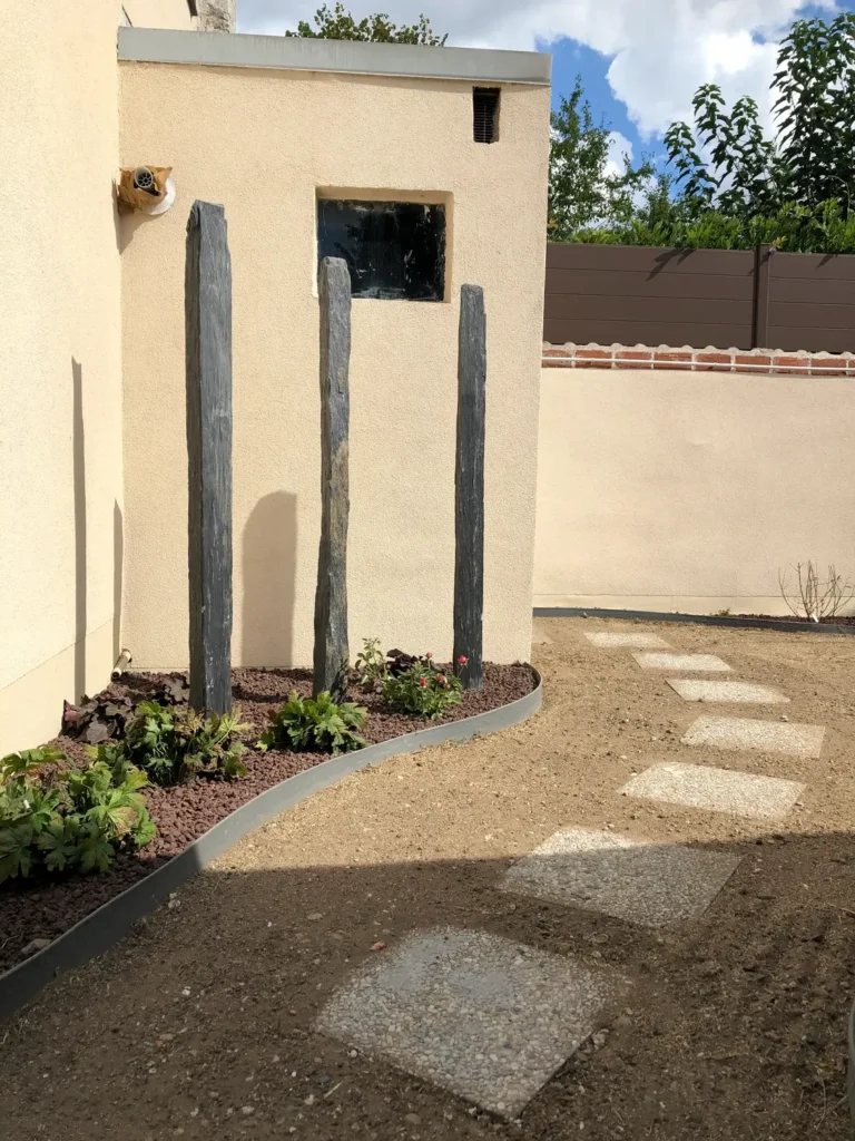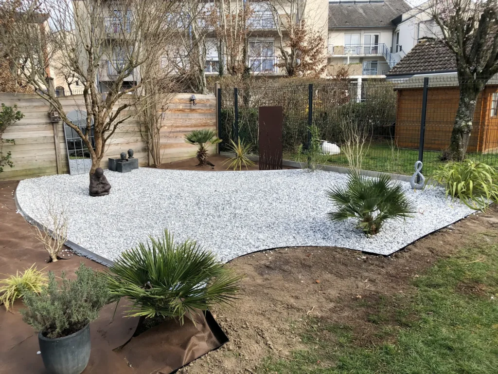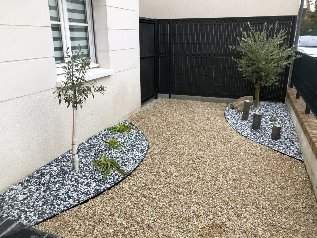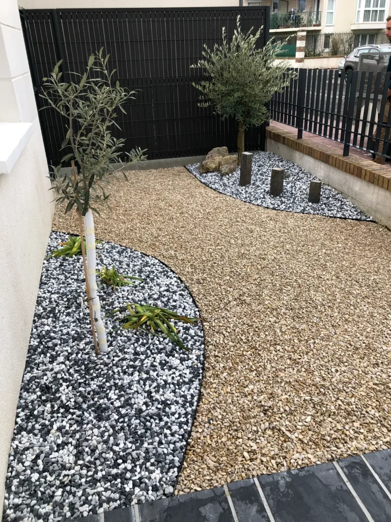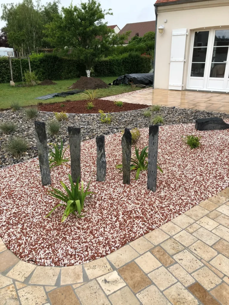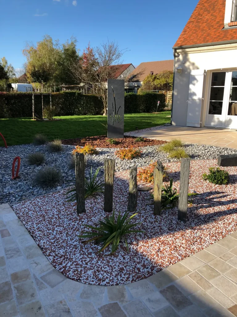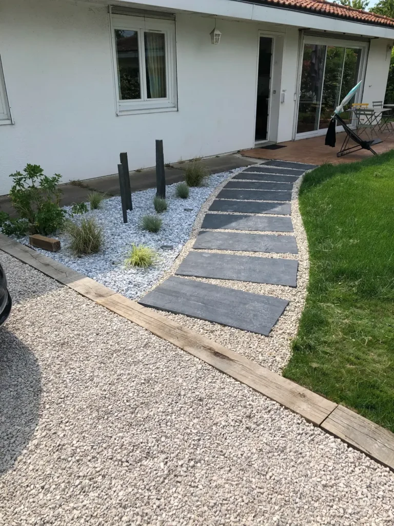 Jardins secs composés de graviers, galets, piquets d’ardoise, …