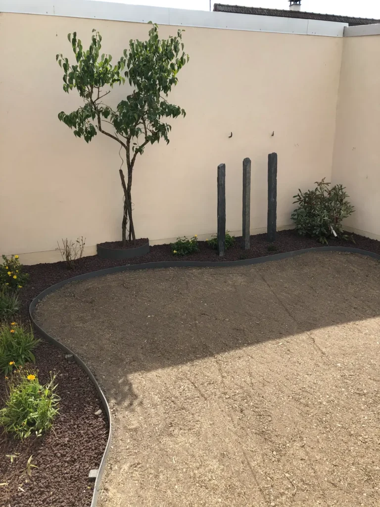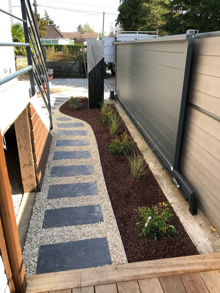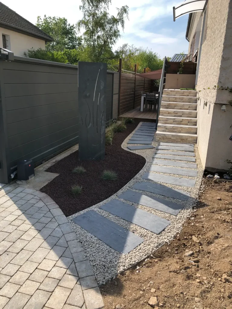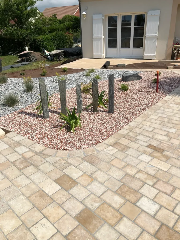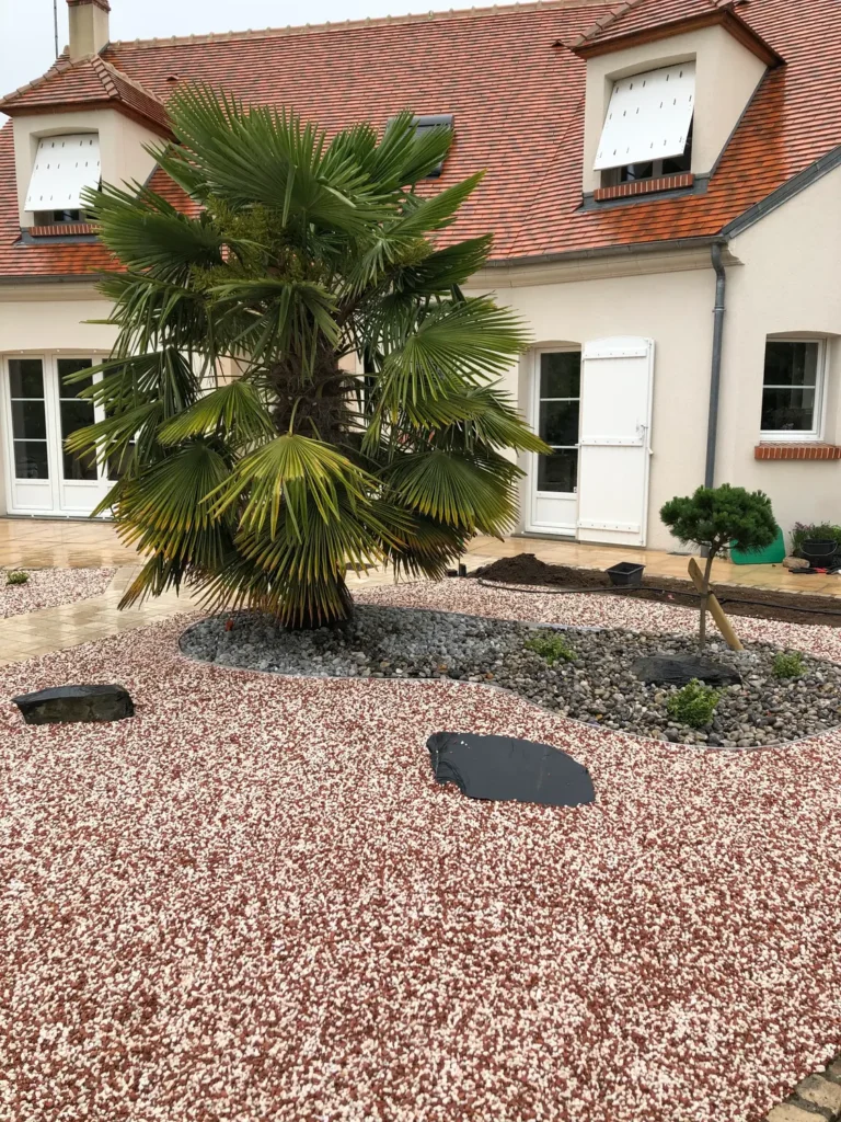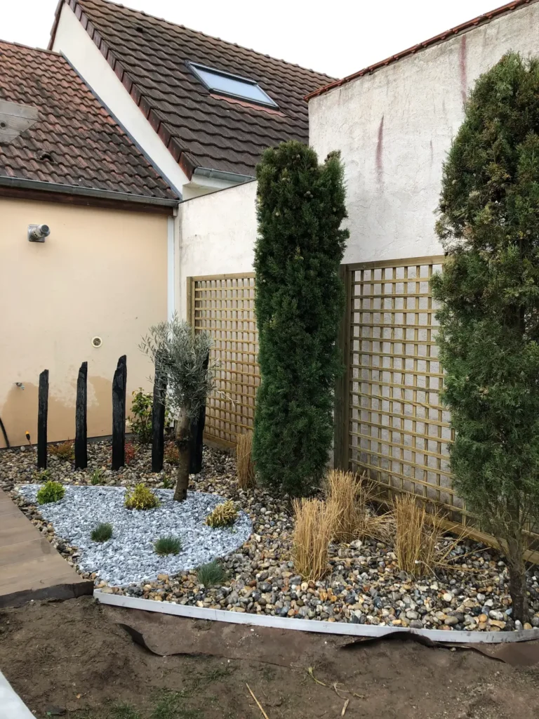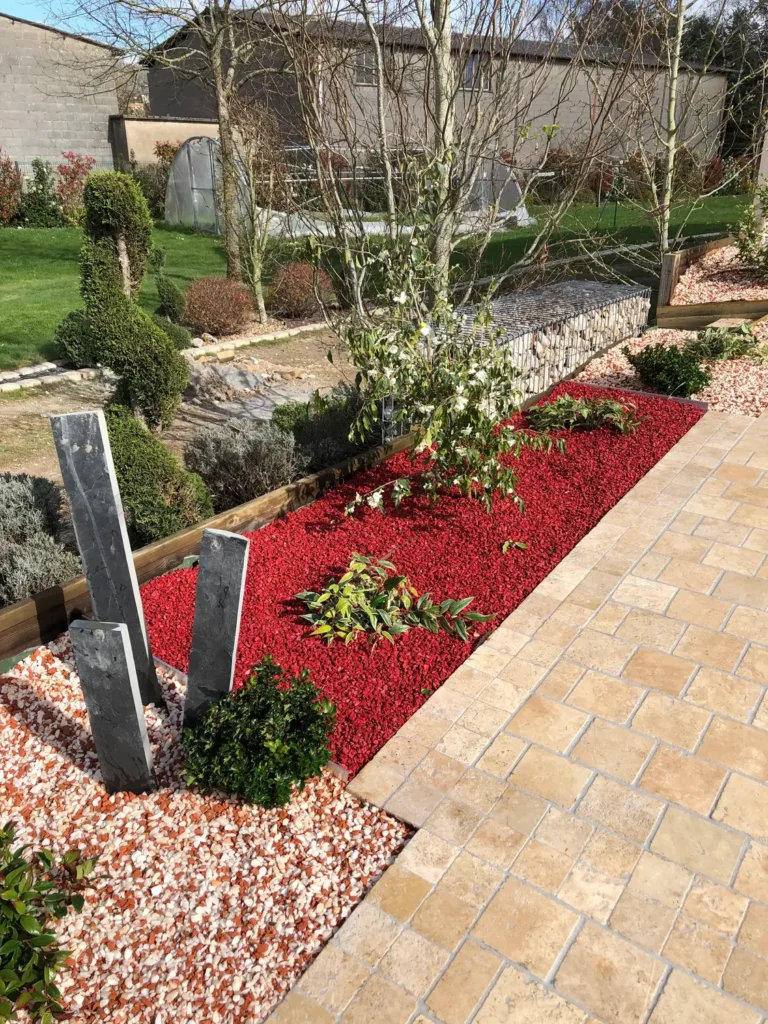 Jardins secs composés de graviers, galets, piquets d’ardoise, …